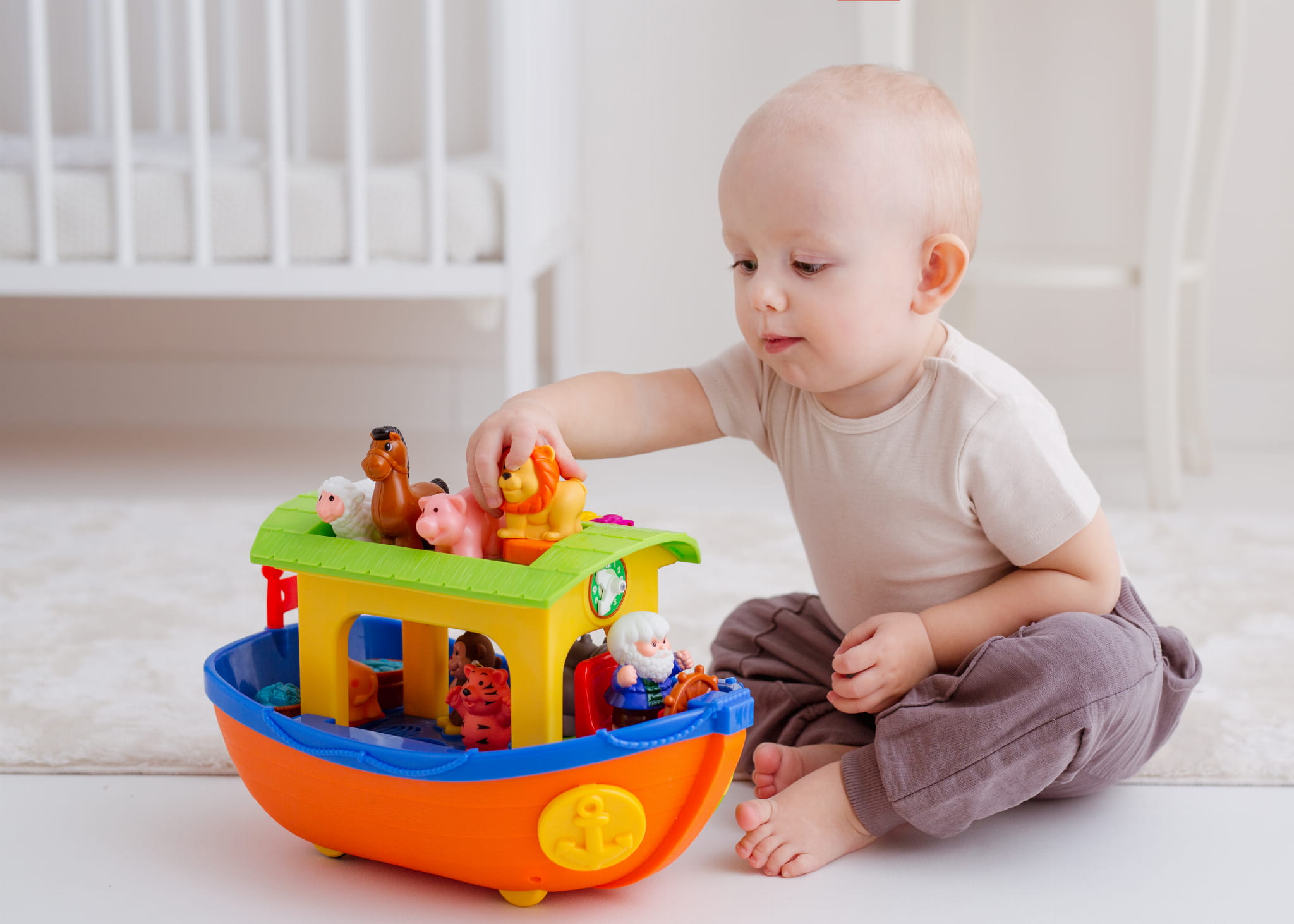 Wyrusz w niezwykłą podróż z Arką Noego i jej wesołą załogą! Ta interaktywna zabawka zawiera 9 kolorowych zwierzątek, które wydają realistyczne odgłosy lub zabawne rymowanki, gdy dziecko dopasuje je do odpowiednich otworów sortera. Dodatkowo, na pokładzie znajduje się mini pianinko, które pozwala maluchowi tworzyć własne melodie. Po przekręceniu steru słychać realistyczne dźwięki, a podczas prowadzenia zabawka porusza się, naśladując ruchy płynącej łodzi. Arka Noego to doskonałe połączenie nauki i zabawy, które rozwija słuch, koordynację oraz logiczne myślenie dziecka.