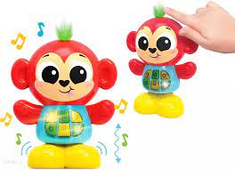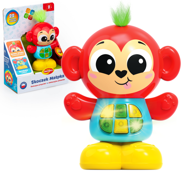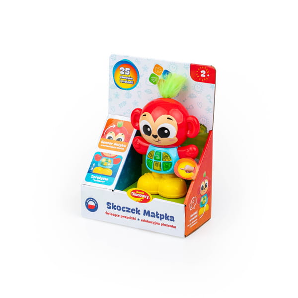 Ten uroczy zwierzak posiada sprężyste nóżki, dzięki czemu można go przycisnąć, słuchając przy tym zabawnych odgłosów sprężynowych skoków! Zabawka mówi po polsku i zna aż 25 różnych dźwięków oraz melodii, w tym także edukacyjną piosenkę.Za uruchamianie poszczególnych funkcji odpowiadają świecące przyciski na brzuszku małpki. Zielona czuprynka wyposażona została w sensor dotyku, dzięki czemu, po dotknięciu jej, usłyszymy zabawne odgłosy.