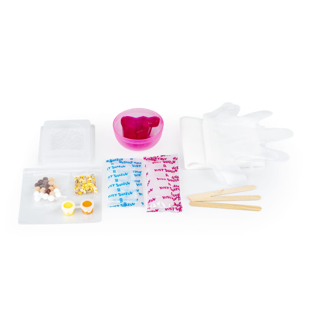 Zawartość zestawu: kleje A i B, 2 barwniki, foremka tosta, posypki, kubeczki, mata, rękawiczki, mieszadełka.