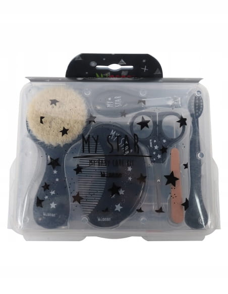 MINENE Zestaw Pielęgnacyjny 6w1 Czarny Czarny zestaw pielęgnacyjny 6w1 Minene zawiera wszystkie niezbędne narzędzia do pielęgnacji niemowląt, takie jak szczotka, grzebień, nożyczki, pilniczek, termometr i obcinacz do paznokci. Elegancki i praktyczny zestaw dla nowych rodziców.