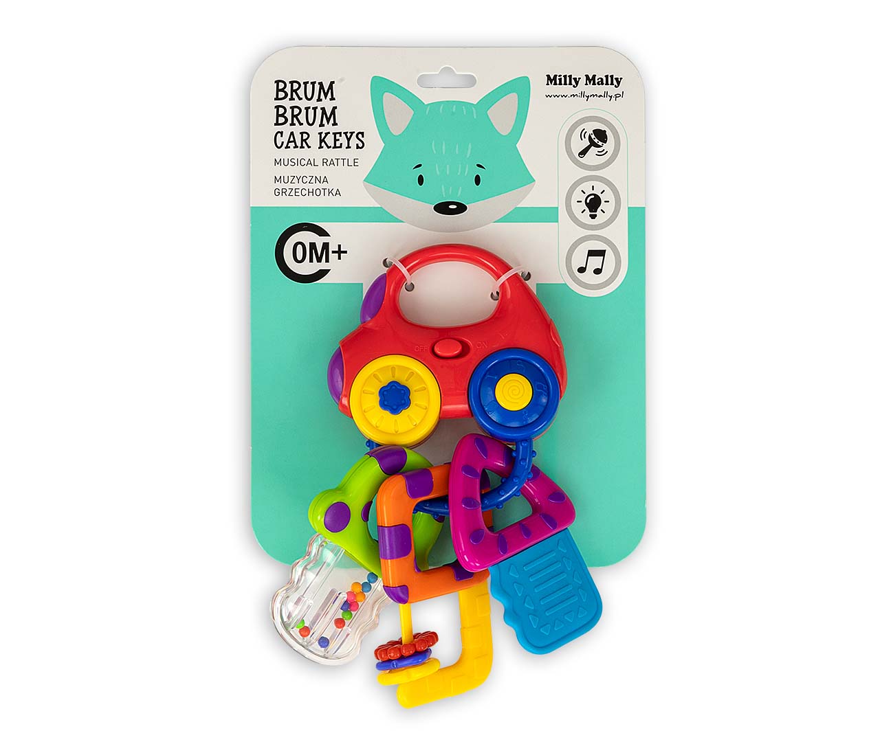 Muzyczna grzechotka od Milly Mally w kształcie autka z zawieszkami. Autko posiada uchwyt do łatwego chwytania, włączniki światełka i dźwięków. Do niego doczepione są trzy kluczyki samochodowe. Każdy z kluczyków ma inny kształt: pierwszy to przeźroczysta grzechotka z kuleczkami, druga - kluczyk z ruchomymi kolorowymi krążkami, trzecia to gumowy gryzak z wypustkami. Po naciśnięciu przycisku na przednim kole autko zaczyna świecić i wydawać samochodowe odgłosy (alarm, klakson, odgłos ruszającego pojazdu). Po naciśnięciu tylnego – świeci i wygrywa wesołe melodyjki. Przełącznik on/off – światełko i odgłos zapalanego silnika.