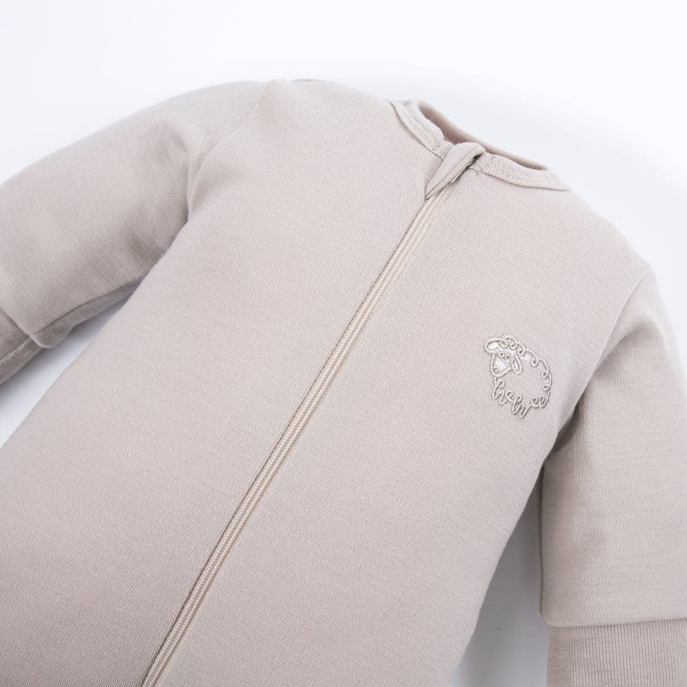 Beżowy pajacyk dziecięcy z wełny merynosów. Pajacyk wykonany z najwyższej jakości wełny merynosów, która doskonale reguluje temperaturę, zapewniając komfort zarówno w chłodniejsze, jak i cieplejsze dni. Dzięki naturalnym właściwościom oddychającym i odprowadzającym wilgoć, materiał jest idealny dla wrażliwej skóry dziecka. Pajacyk wyposażony jest w dwustronny zamek błyskawiczny, co ułatwia szybkie przebieranie maluszka, a regulowane mankiety pozwalają na idealne dopasowanie do rosnącego dziecka.