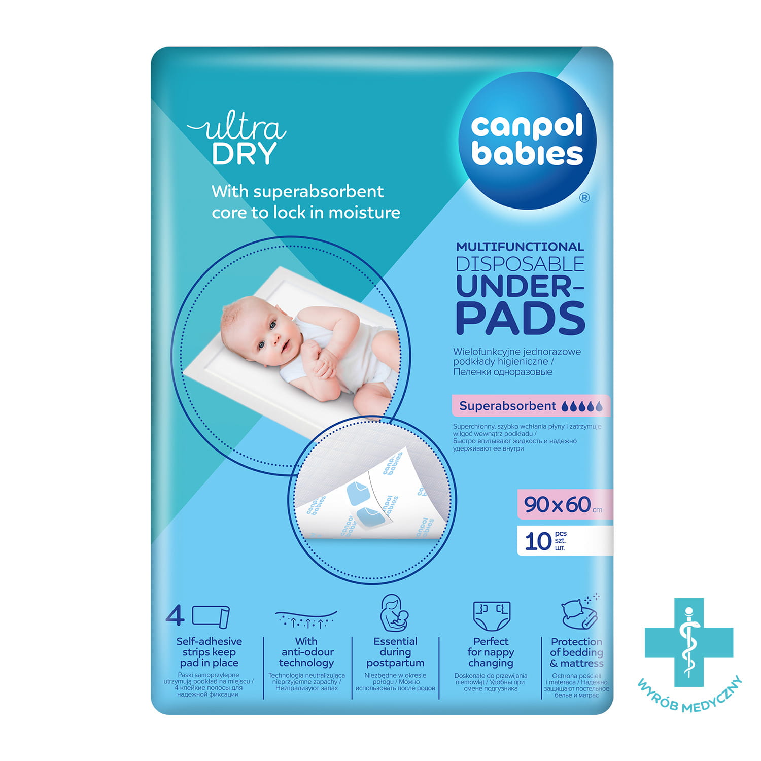 Innowacyjne wielofunkcyjne podkłady higieniczne Canpol babies z paskami samoprzylepnymi i wodoodporną warstwą ochronną na spodzie podkładu doskonale sprawdzają się w wielu sytuacjach. Superchłonny wkład szybko wchłania płyny i zatrzymuje wilgoć wewnątrz podkładu. Podkłady higieniczne są niezbędne dla kobiet w okresie połogu, zabezpieczają pościel i materac przed zabrudzeniem. Dzięki 4 paskom samoprzylepnym utrzymują podkład na łóżku – nie przesuwa się i nie roluje, zwiększając Twój komfort. Doskonale sprawdzają się podczas przewijania Maluszka, w podróży, podczas wizyty w przychodni czy jako zabezpieczenie materaca (przeciekająca pieluszka, ulewanie itd.) oraz w nauce odpieluchowania.