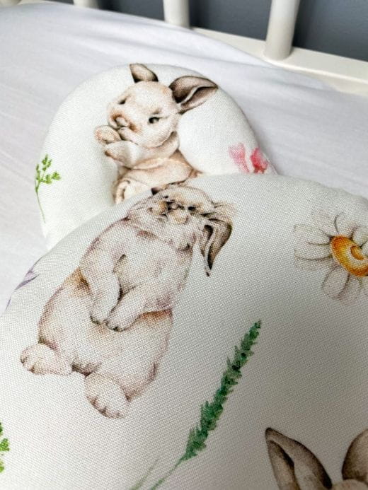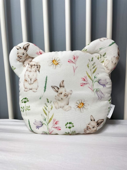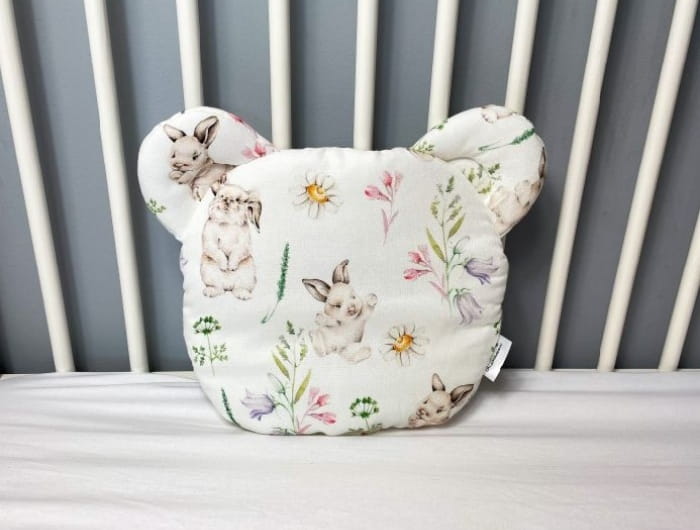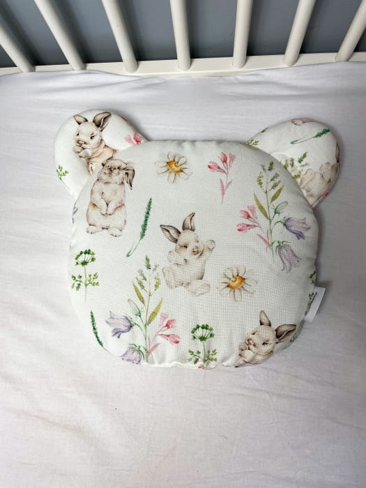 poduszka dla niemowląt o wymiarach 28 cm x 28 cm (+/- 2 cm) z dodatkowymi uszkami. Poduszka jest płaska i przeznaczona już od pierwszych dni życia dziecka. Wkład w środku jest antyalergiczny i przyszyty na stałe do tkaniny, co zapobiega przemieszczaniu się podczas użytkowania i prania.