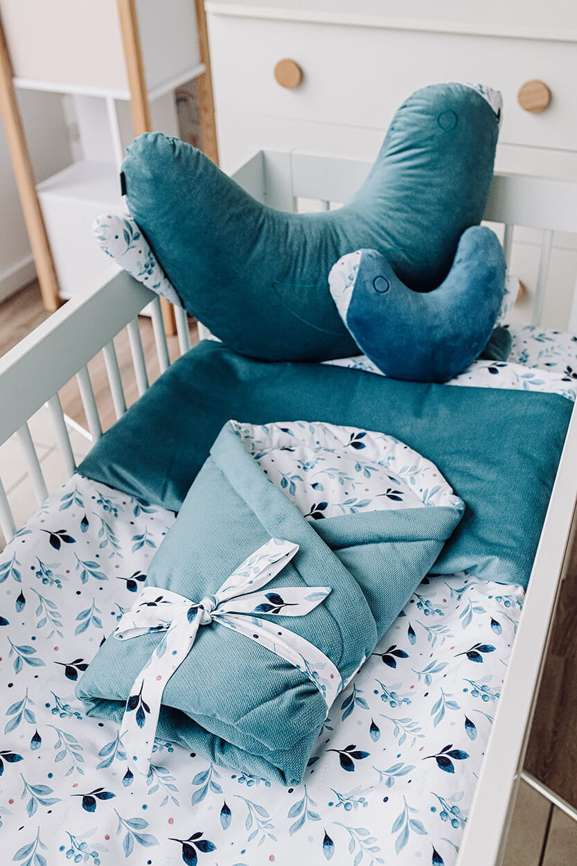 Jest wykonany z dwóch rodzajów tkanin: 100% bawełny i 100% velvetu, co zapewnia miękkość i komfort dla delikatnej skóry dziecka.