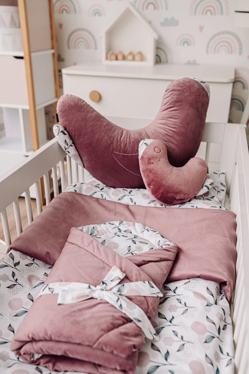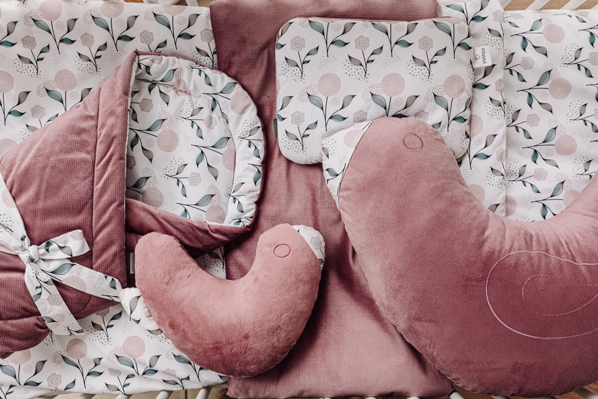 Jest wykonany z dwóch rodzajów tkanin: 100% bawełny i 100% velvetu, co zapewnia miękkość i komfort dla delikatnej skóry dziecka.