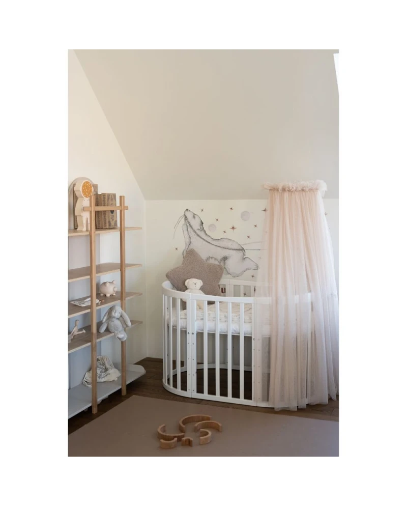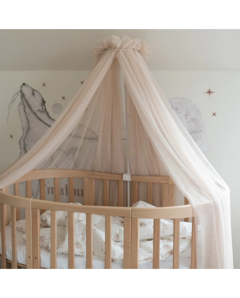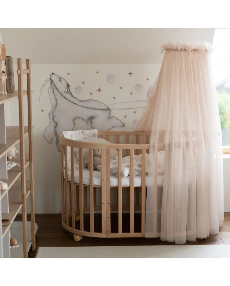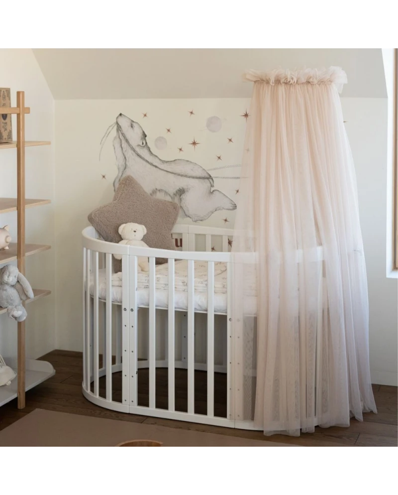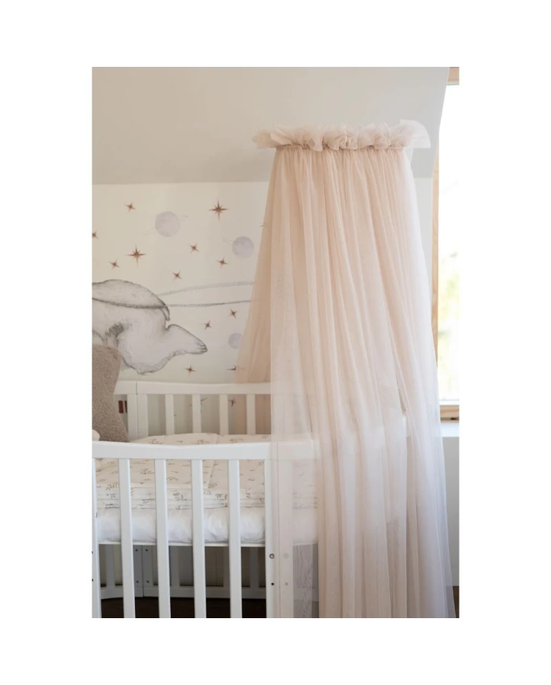 Stwórz wyjątkową i przytulną przestrzeń dla maluszka dzięki tiulowemu baldachimowi na stelażu, idealnie dopasowanemu do łóżeczek 7w1. To nie tylko estetyczny element dekoracyjny, ale także praktyczne rozwiązanie, które wspiera spokojny sen dziecka.