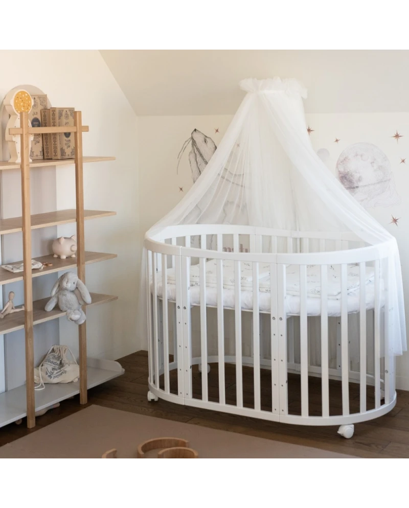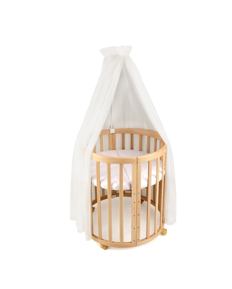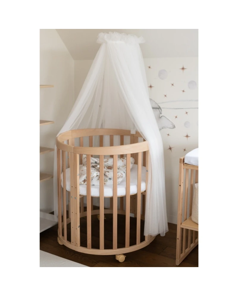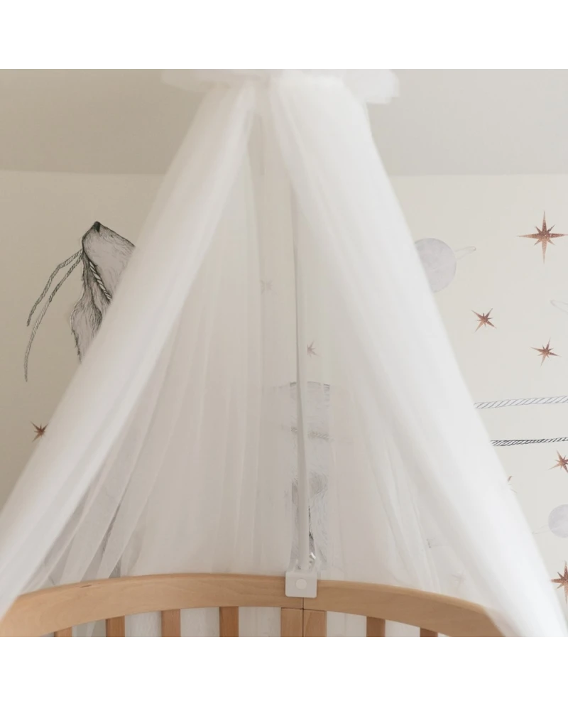 Stwórz wyjątkową i przytulną przestrzeń dla maluszka dzięki tiulowemu baldachimowi na stelażu, idealnie dopasowanemu do łóżeczek 7w1. To nie tylko estetyczny element dekoracyjny, ale także praktyczne rozwiązanie, które wspiera spokojny sen dziecka.