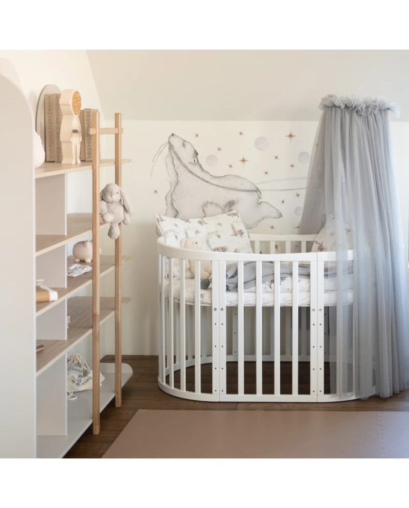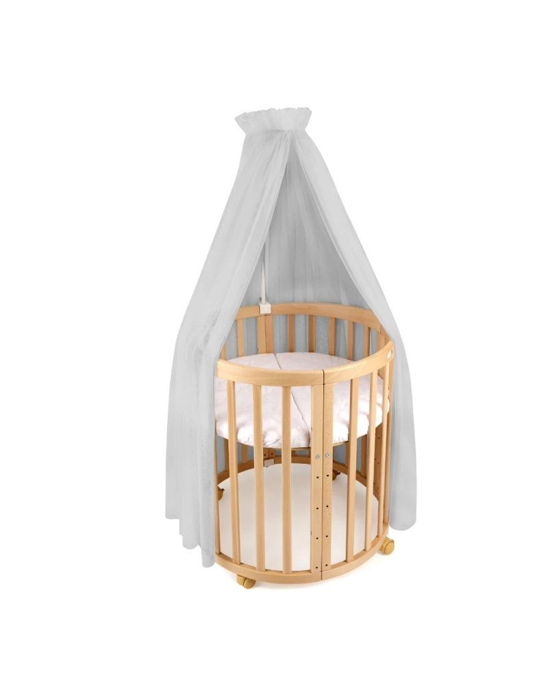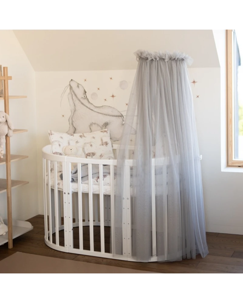 Stwórz wyjątkową i przytulną przestrzeń dla maluszka dzięki tiulowemu baldachimowi na stelażu, idealnie dopasowanemu do łóżeczek 7w1. To nie tylko estetyczny element dekoracyjny, ale także praktyczne rozwiązanie, które wspiera spokojny sen dziecka.