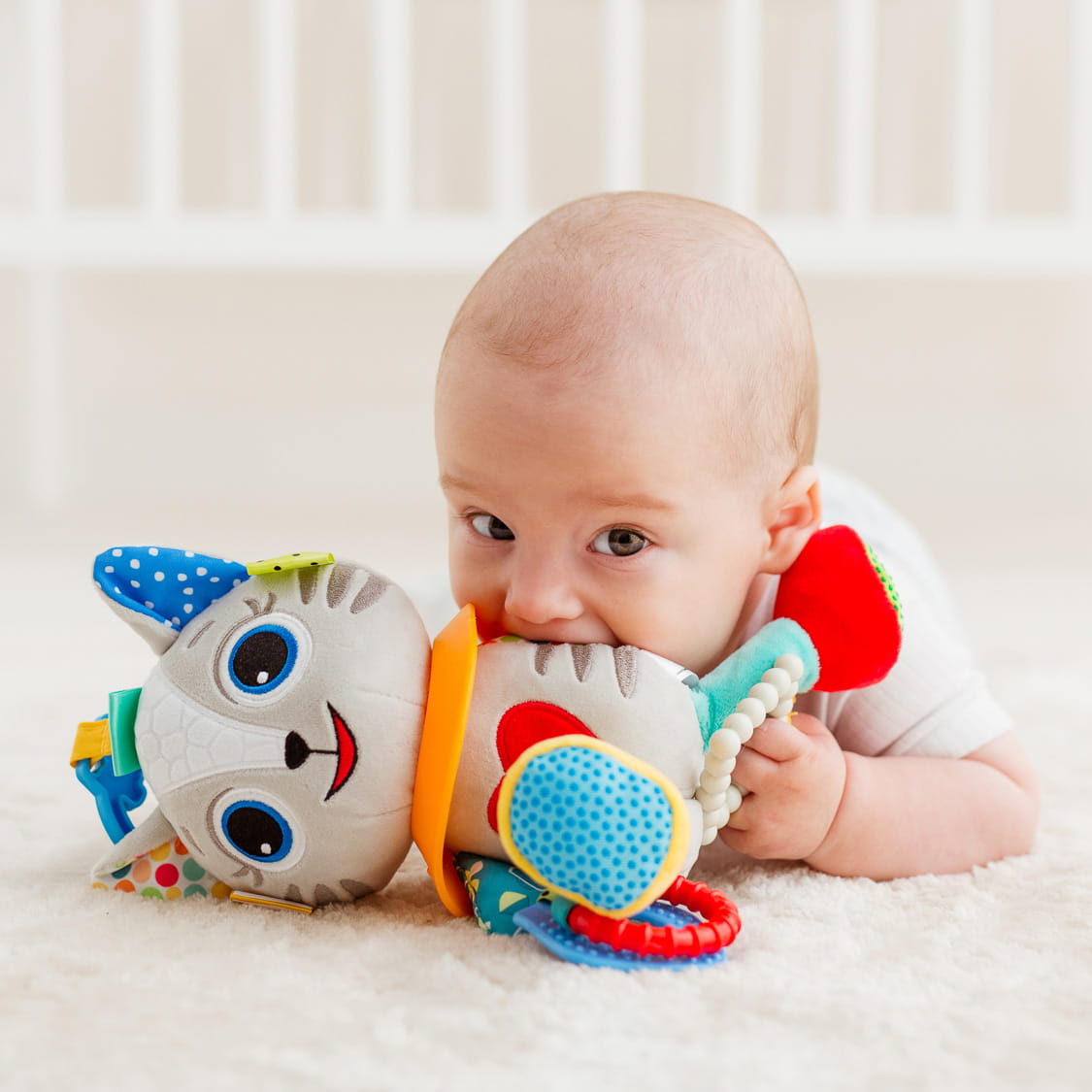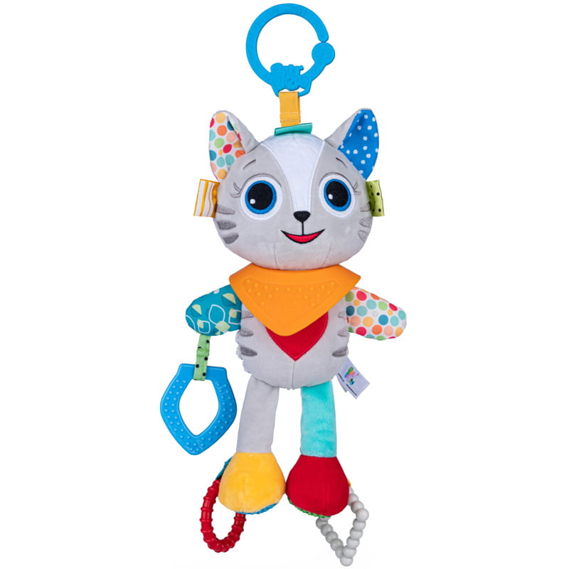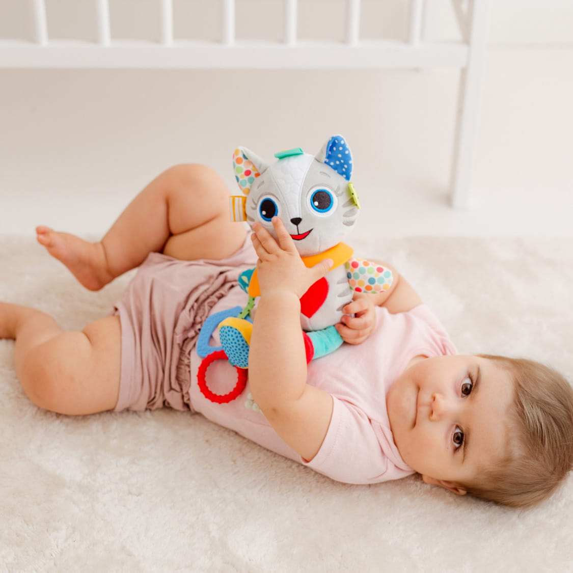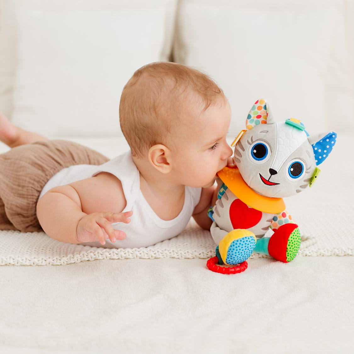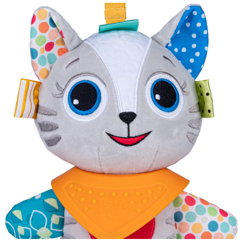 Jest niezastąpionym pomocnikiem podczas ząbkowania. Kicia posiada w twarde oraz miękkie gryzaczki z wypustkami, które podczas gryzienia masują obolałe dziąsła malucha.