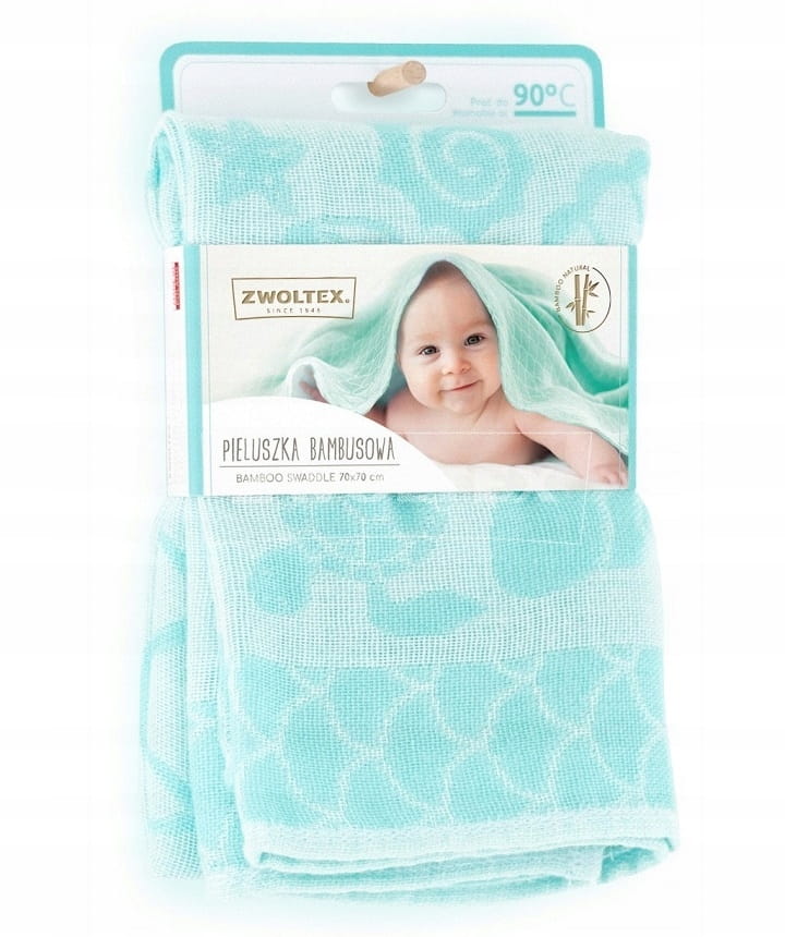 Zwoltex Pielucha bambusowa - MUSZELKI miętowe Bambusowa pieluszka z motywem muszelek w kolorze miętowym. Miękka i delikatna, doskonale nadaje się do pielęgnacji niemowląt, zapewniając komfort i przewiewność. Idealna do użytku na co dzień.