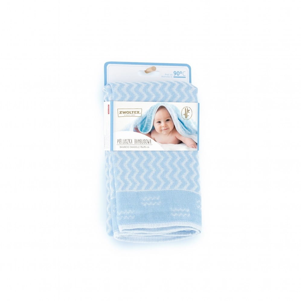 Zwoltex Pielucha bambusowa - ZYGZAKI niebieskie Pieluszka bambusowa marki Zwoltex o wymiarach 75x75 cm, ozdobiona niebieskim wzorem zygzaków. Wykonana z miękkiego, przyjaznego dla skóry materiału bambusowego, doskonała do codziennej pielęgnacji i otulania niemowląt.