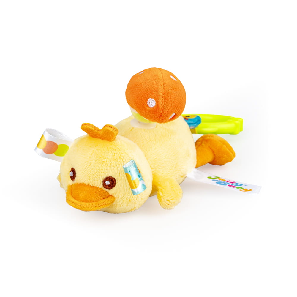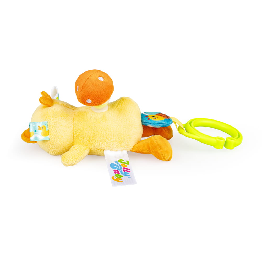 Ten uroczy kaczorek zachwyci każdego malucha! W jego wnętrzu ukryty jest dzwoneczek, który wydaje radosne dźwięki przy potrząsaniu. Na grzbiecie znajduje się pluszowy grzybek, który zaczyna się kręcić, gdy dziecko pociągnie za kółeczko z pszczółką przy zawieszce lub za dołączonego Jasia. Po chwili kaczorek podciąga się z powrotem na tasiemce, wesoło przy tym wibrując. Różnorodne faktury materiałów pobudzają zmysł dotyku, a praktyczna zawieszka umożliwia przymocowanie zabawki w dowolnym miejscu.