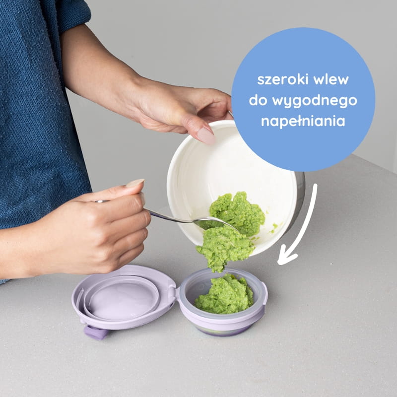 - Szeroki wlew do wygodnego napełniania przecierem, musem, budyniem lub kaszką.