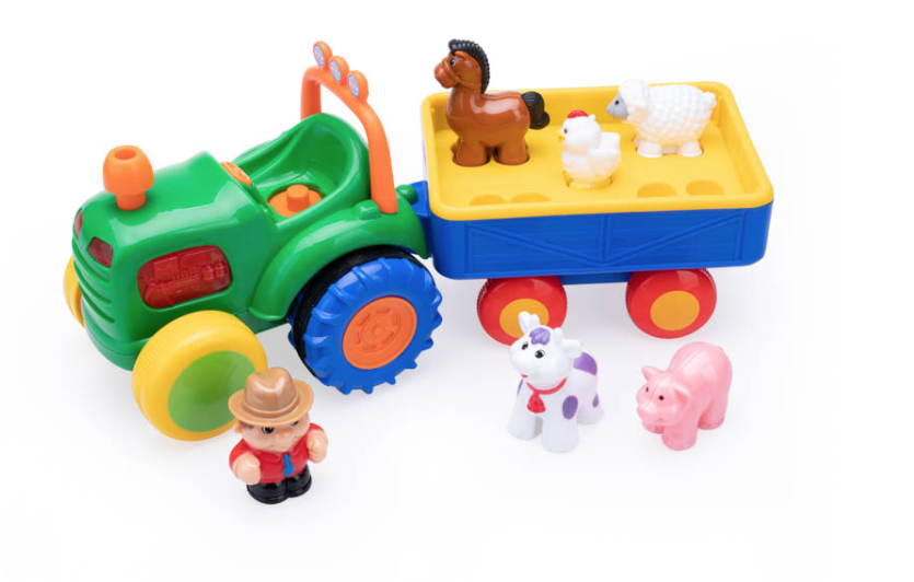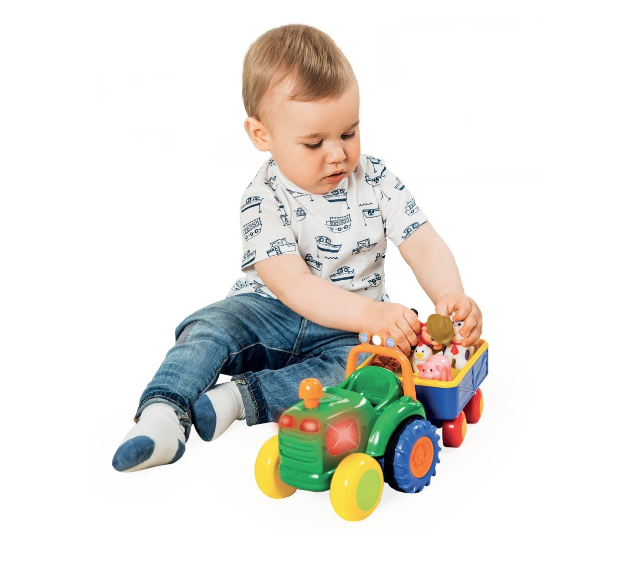 Dumel Discovery Traktor Farmer to interaktywny pojazd, który przenosi dziecko w świat wiejskich przygód. Zestaw zawiera traktor, przyczepę oraz pięć figurek zwierząt – krowę, konika, kurkę, owieczkę i świnkę. Maluch może tworzyć własne scenariusze zabawy, przewozić zwierzątka w przyczepie i uczyć się odpowiedniego dopasowania figur do kształtów na przyczepie.